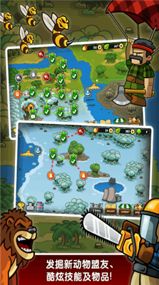2、多维成长体系:每个动物单位拥有独立的天赋树系统,通过香蕉资源可激活特殊技能,例如猩猩的群体嘲讽与熊猫的竹林屏障