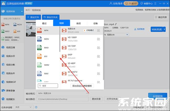 成功导入文件后进入参数配置阶段。在输出格式选择栏中,展开下拉菜单可选取MP4作为目标格式,同时支持分辨率规格的灵活调整。高级用户可启用「自定义参数模板」进行深度设置。