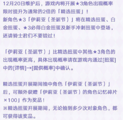 2021年12月20日版本更新后,玩家可通过「精选扭蛋」概率UP活动获取该角色。特殊卡池设置三星角色综合出现率提升至2倍,且圣诞伊莉亚享有独立概率加成。成功抽取角色时可额外获得100枚专属记忆碎片,极大缩短角色升星培养周期。