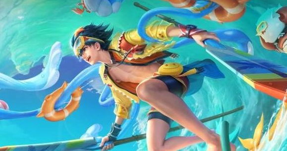 本次皮肤以清凉夏日为主题进行创意延展,通过明快的色彩搭配与海洋元素组合,塑造出极具辨识度的海滩少年形象。设计师在保留英雄核心特征的基础上,将传统飘带改造成浪花造型,搭配河豚造型救生圈装饰,武器特效则采用鳐鱼环绕的动态效果,整体视觉呈现充满活力。