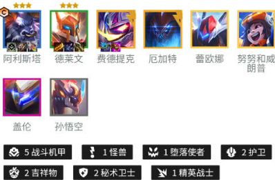 1、核心成员配置:阿利斯塔作为主坦搭配德莱文主C,配合费德提克、厄加特构成控制链,蕾欧娜与努努提供前排承伤,盖伦与孙悟空完善羁绊体系。
