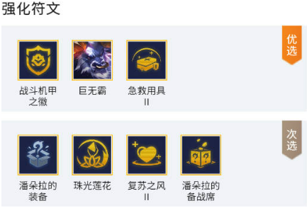 (1)优先选取战斗机甲之徽提升阵容上限,阿利斯塔专属强化巨无霸可显著增强生存能力,急救用具II强化全队续航