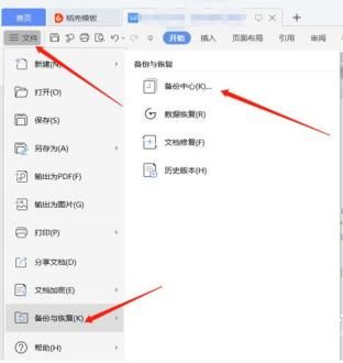启动WPS客户端后,界面左上角可见显眼的「文件」选项。点击展开菜单栏,选择「备份与恢复」二级菜单,此时会弹出功能扩展面板,点击蓝色字体的「备份中心」即可进入核心管理界面。