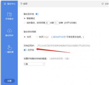 进入备份中心后,右侧功能栏可见「设置」与「备份同步」两个关键模块。建议用户优先选择「备份同步」选项,在此界面中找到「文档云同步」开关控件。点击开启后,软件顶部状态栏会出现云朵图标,表示已成功激活云端同步服务。