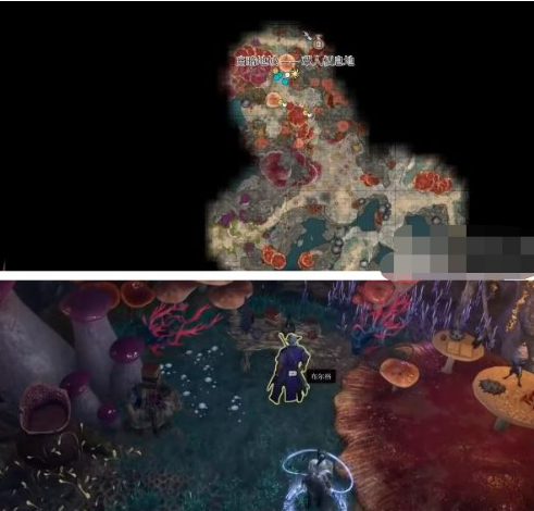 1、首先需要前往游戏中的特殊区域【幽暗地域】,该区域位于地图西北方位,可通过完成前置任务解锁传送功能。抵达后选择【蕈人栖息地】传送锚点进行定位,该区域布满发光真菌的独特地貌是重要识别特征。在栖息地中央位置可发现游商NPC【布尔格】,该角色身着紫色长袍并携带发光背包的造型极具辨识度。