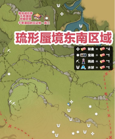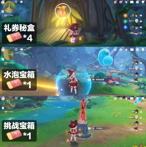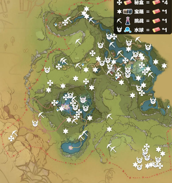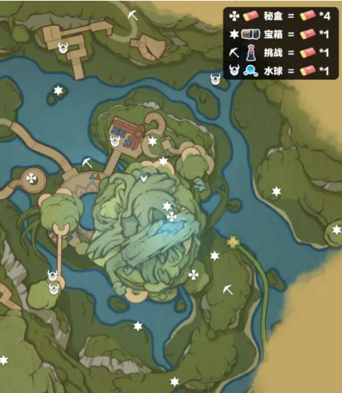 地图中分布着四类可交互标记:密盒(四叶草标识)、宝箱(六芒星标识)、限时挑战(镐头标识)以及水泡机关(敌人标识)。其中密盒可产出4张礼券,其余三类各产出1张。建议优先清理带有四叶草标记的高收益点位,配合区域移动装置可显著提升探索效率。