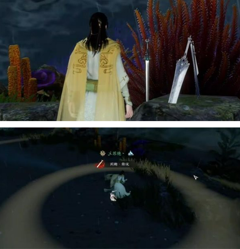2、抵达秘境核心区域后,需依次激活场景内的双剑机关。首先靠近嵌入岩壁的玄铁重剑进行交互,触发地面震颤效果后立即转向右侧石台上的轻剑进行二次拔剑操作。两把武器共鸣产生的能量波动会解开酒坛封印,此时可拾取琼浆玉液完成场景探索进度。