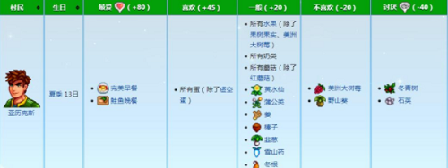 春季优先选择黄水仙搭配早餐组合,夏季推荐冰镇水果拼盘,秋季可用榛子制作特色点心,冬季则适合赠送热牛奶等暖身饮品。生日季(夏季13日)赠送鲑鱼晚餐可获三倍好感加成。