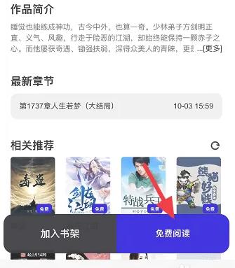 以武侠题材为例,点击对应分类后系统会推送该类型优质作品。用户可通过滑动屏幕浏览作品封面及简介,遇到感兴趣的内容可直接点击进入详情页。重点注意「免费阅读」按钮的位置设计,该功能支持用户直接进入正文界面。