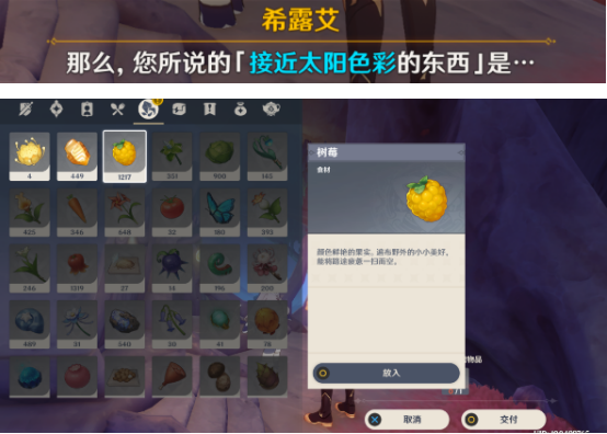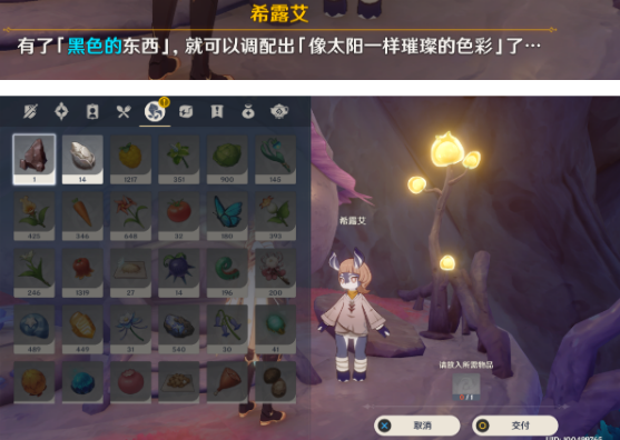 在海沫村找到NPC希露艾触发任务后,旅行者需要完成三阶段物品提交。第一阶段对话时,系统会要求选择符合特定颜色特征的物品进行提交。建议优先选择背包中常见的金色素材,例如星银矿石或锻造用合金材料,这类物品既符合任务要求又便于获取。