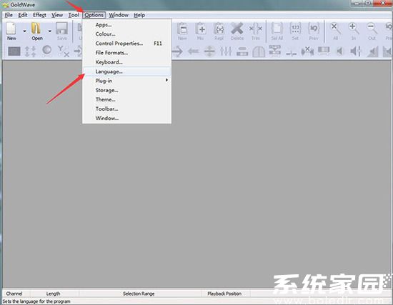 1、启动应用程序后,在顶部导航栏定位"Options"菜单项,展开下拉列表后选择"Language"选项;