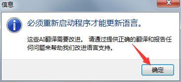 3、点击确认按钮后,软件会提示需要重新启动以应用新语言设置,请保存当前工作进度后关闭程序;