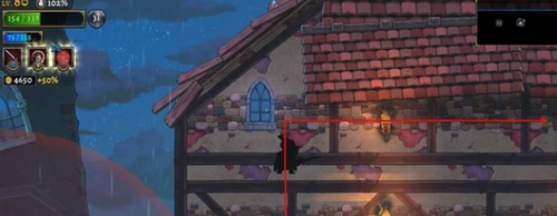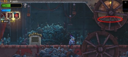 从世界之轴王座传送点(即BOSS战准备区域)逆向探索,穿过拱形回廊可发现两组巨型水车装置。此处需注意第二个水车上方的特殊墙体结构,使用角色法术技能或特定天赋能力破坏墙体(如图示标记区域),成功开辟通道后借助二段跳跃登上平台。