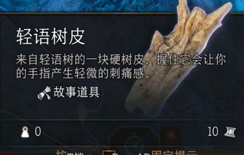 4、完成障碍清理后,沿树干纹理走向移动。接近主树干时触发互动提示,长按ALT键显示可采集标记。执行采集动作后将获得稀有素材【轻语树皮】,该过程会引发轻微地震效果属正常现象。